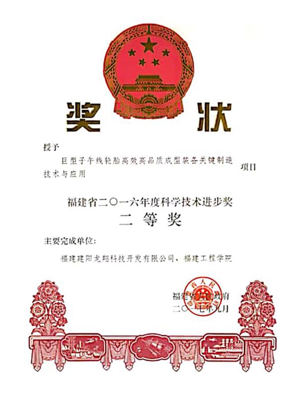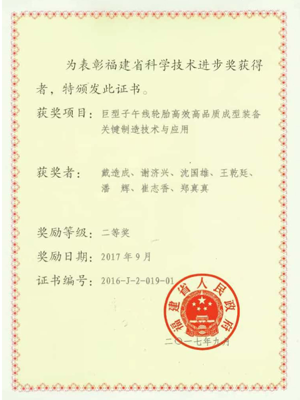福建省2016年度科學技術進步獎二等獎-巨型子午線輪胎高效高品質成型裝備關鍵制造
